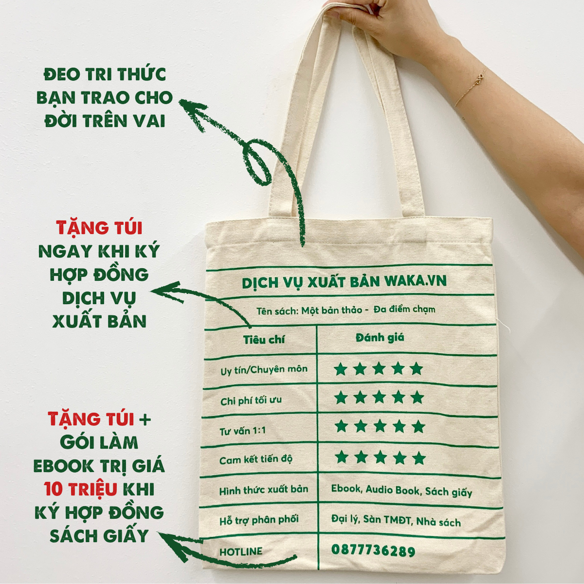 Chỉ cần ký hợp đồng dịch vụ xuất bản bất kỳ (bao gồm full khâu, tách từng khâu của ebook, audiobook hoặc sách giấy) đều sẽ được tặng 01 túi canvas vải tiện dụng.