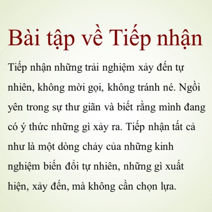Tiếp nhận những trải nghiệm xảy đến tự nhiên, không mời gọi, không tránh né. Ngồi yên trong sự thư giãn và biết rằng mình đang có ý thức những gì xảy ra. Tiếp nhận tất cả như là một dòng chảy của những kinh nghiệm biến đổi tự nhiên, những gì xuất hiện, xảy đến, mà không cần chọn lựa.