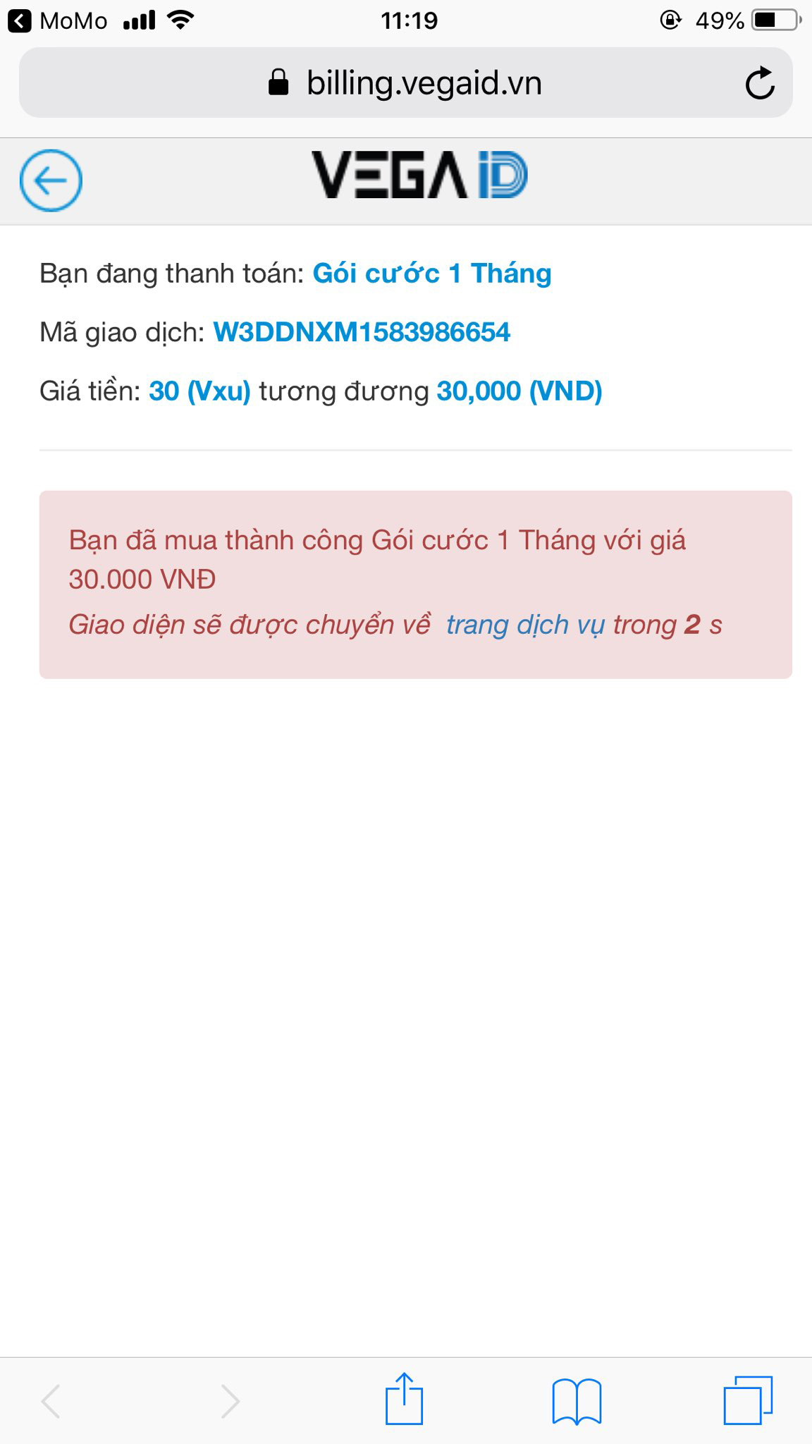 Thông báo xác nhận đăng ký thàng công gói hội viên 1 tháng