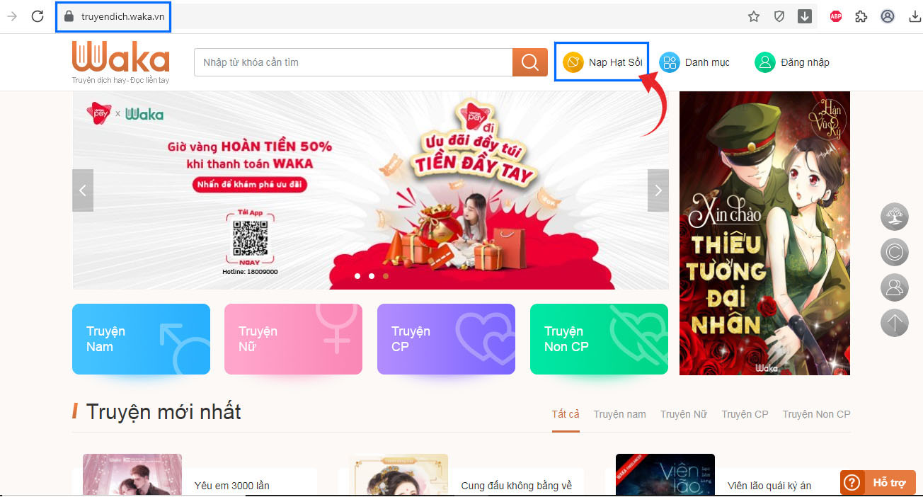 - Bước 1: Truy cập website https://waka.vn/ chọn Nạp Hạt Sồi (bên phải màn hình)