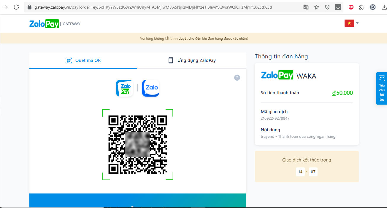 - Bước 3: Sau khi đăng nhập thành công, màn hình sẽ chuyển sang giao diện thanh toán kèm mã QR. Độc giả vui lòng sử dụng app ZaloPay và thực hiện quét mã hoàn thành giao dịch.