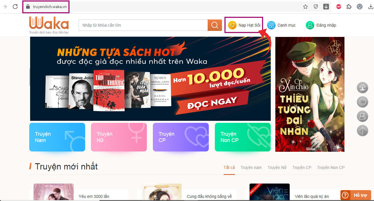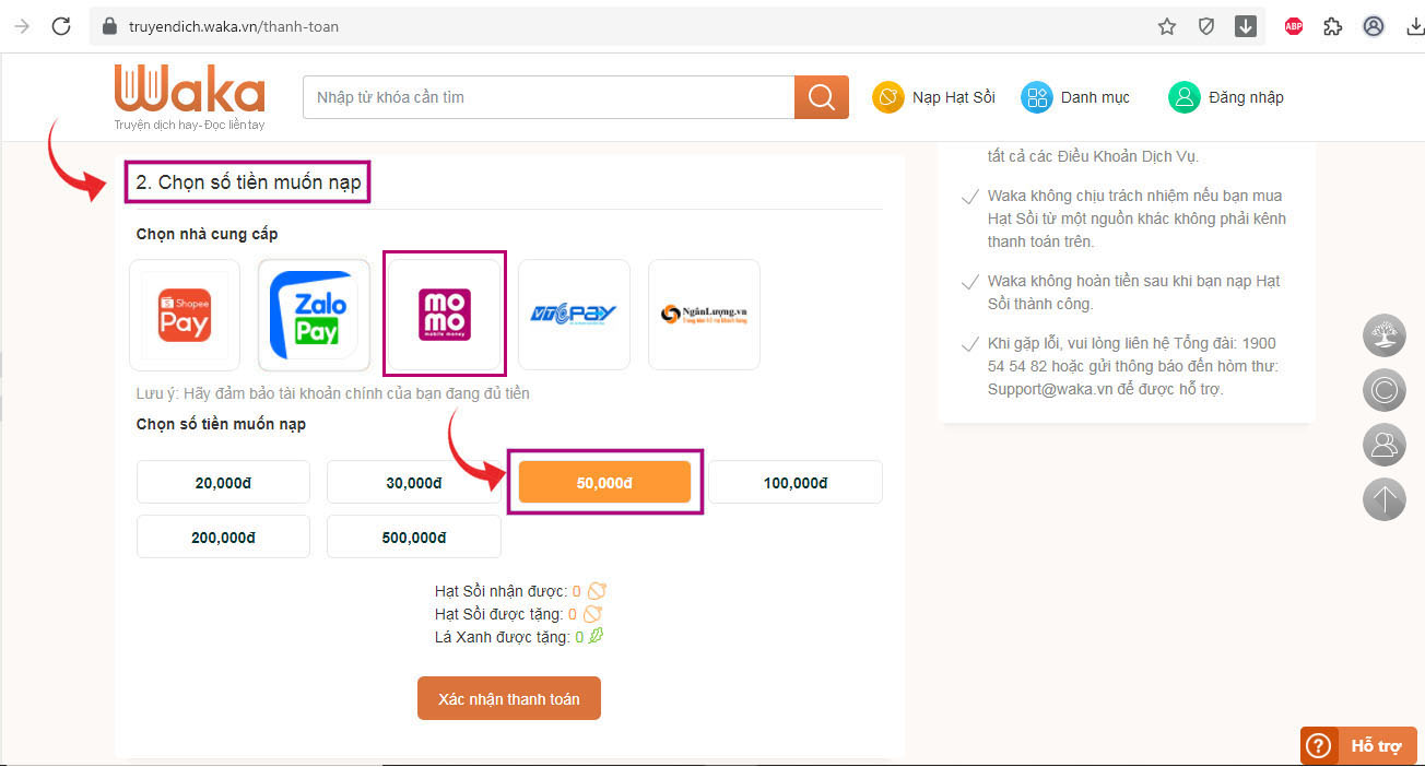 - Bước 1: Truy cập https://waka.vn/ chọn Nạp Hạt Sồi (bên phải màn hình)