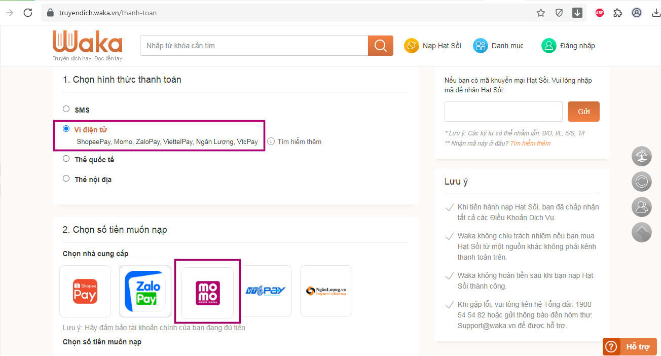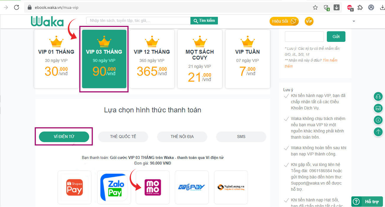 - Bước 2: Lựa chọn gói HỘI VIÊN Waka, chọn Ví điện tử (MoMo)