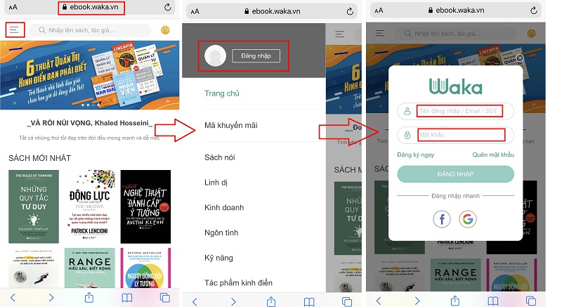 - Bước 1: Truy cập https://waka.vn trên thiết bị di động, đăng nhập/ đăng ký tài khoản Waka (vui lòng xem chi tiết các bước dưới ảnh)