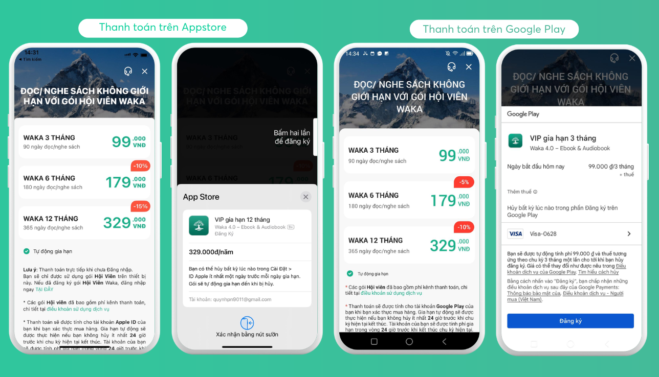 Để thanh toán các gói đọc sách trên Waka, quý độc giả có thể thanh toán qua các kênh thanh toán Apple/ Google Play
