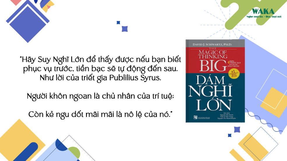 Khi đọc “Dám nghĩ lớn”, ta sẽ nhận ra chính mình đang bị nỗi sợ hãi chi phối, làm chùn bước chân, không dám tiến lên, càng không dám theo đuổi những giấc mơ mà ta cho là viển vông. Cuốn sách sẽ giúp ta xóa đi nỗi sợ hãi đó, quét sạch những rào cản tự ti để ta có thể tin vào chính mình và để “dám nghĩ lớn”.