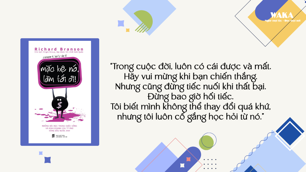 Trên đường đời bạn sẽ gặp vô số ngã rẽ, đi được đúng đường là rất vất vả nhọc nhằn, bởi vì có những thách thức đang đợi chờ bạn ở phía trước. Bạn sẽ không biết bạn phải đương đầu với bao nhiêu thử thách, nếu bạn đang cảm thấy hoang mang rối bời vì không có động lực để đối mặt với những khó khăn đó, hãy đọc cuốn sách “Mặc kệ nó, làm tới đi!” của tác giả Richard Branson để có cho mình động lực và niềm tin vào con đường phía trước mình đi. Cuốn sách gồm 14 chương và cũng là 14 lời khuyên tác giả gửi gắm đến người đọc nếu muốn chinh phục thành công, đến gần hơn với cuộc sống mơ ước. Đó là những trải nghiệm, câu chuyện của chính bản thân tác giả đã đi qua đã có được thành công như hiện tại. Ngay từ tên cuốn sách đã đem đến cho ta một cảm giác rất táo bạo, liều lĩnh, dũng cảm, dường như đang hối thúc giục giã người đọc nên mặc kệ mọi thứ để làm điều mình muốn. Nhưng mặc kệ ở đây không phải bất chấp tất cả, liều lĩnh như thiêu thân lao vào lửa, phó mặc vào may mắn và số phận, mà mặc kệ ở đây có nghĩa là mặc kệ mọi sợ hãi và hoài nghi, mặc kệ mọi thứ để làm được mình mong muốn dựa trên sự chuẩn bị kĩ lưỡng và thực tế hiện tại.