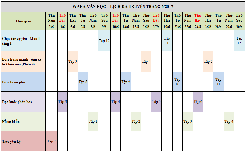 Lịch ra truyện hàng tuần trên Waka như sau: