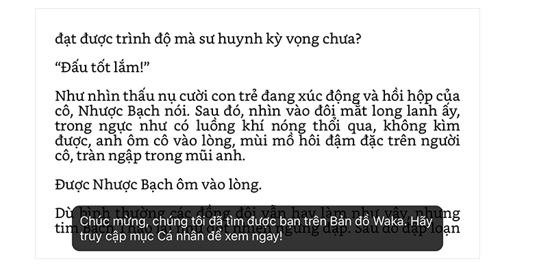 Việc ghi nhận thời gian đọc này vẫn diễn ra cả khi bạn đọc sách ở chế độ online lẫn đọc offline. Tuy nhiên, hiện tại, Waka mới chỉ ghi nhận thời gian đọc này trên ứng dụng iOS & Android nên độc giả nào đọc trên website hay ứng dụng windowsphone hãy chờ thêm một thời gian nữa nhé. Khi đạt tiêu chuẩn tham gia TTĐS, bạn sẽ nhận được thông báo ngay trên màn hình đọc sách và cả ở bản đồ Waka.