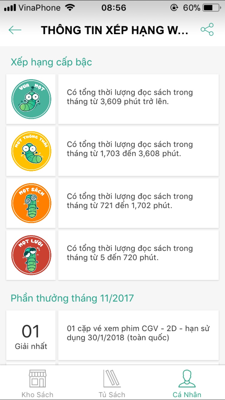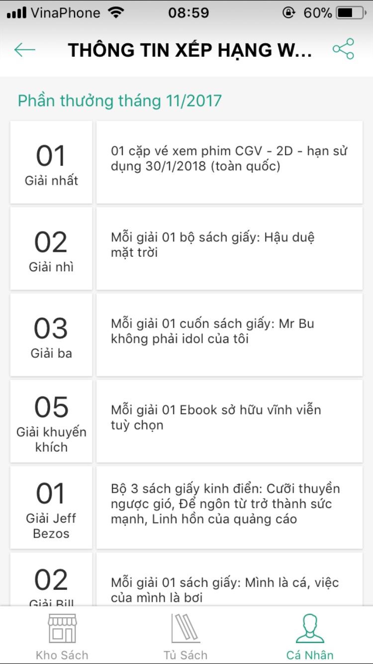 + Các giải cho Top BXH: 01, 02 giải nhì, 03 giải ba và 05 giải khuyến khích (tùy từng tháng): Là giải thưởng cao nhất, có giá trị nhất cho bạn đọc nào có kết quả phút đọc cao nhất. Riếng tháng 11/2017 - phần quà được bổ sung thêm 11 giải giành đặc biệt cho những bạn đọc xuất sắc đọc sách Kỹ năng - Kinh doanh nhiều nhất hàng tháng