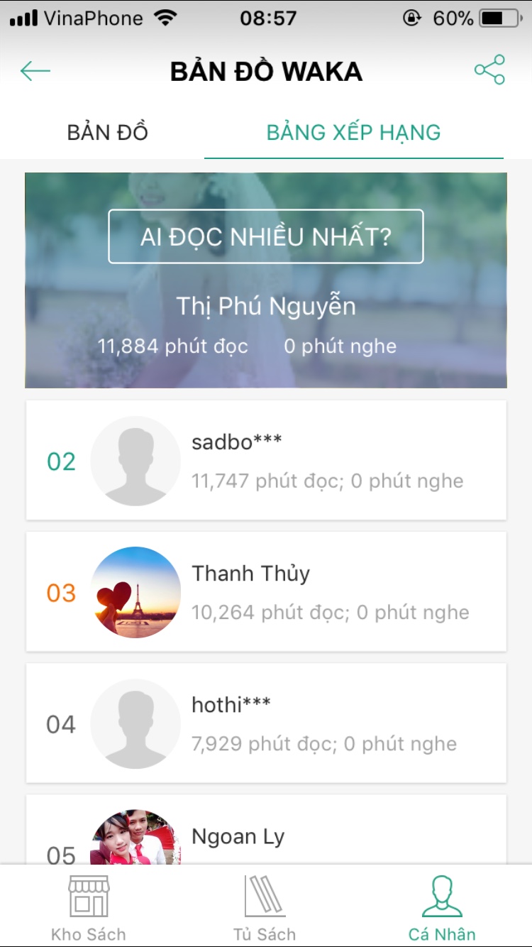 Là nơi thể hiện danh sách những bạn đọc của Waka có số phút đọc cao nhất. BXH được cập nhật liên tục để cho ta thấy ai đang dẫn đầu. Các bạn sẽ thấy tên và ảnh avatar của từng người dùng, do vậy những bạn nào nằm trong Top BXH hãy thay những avatar thật lung linh vào nhé!