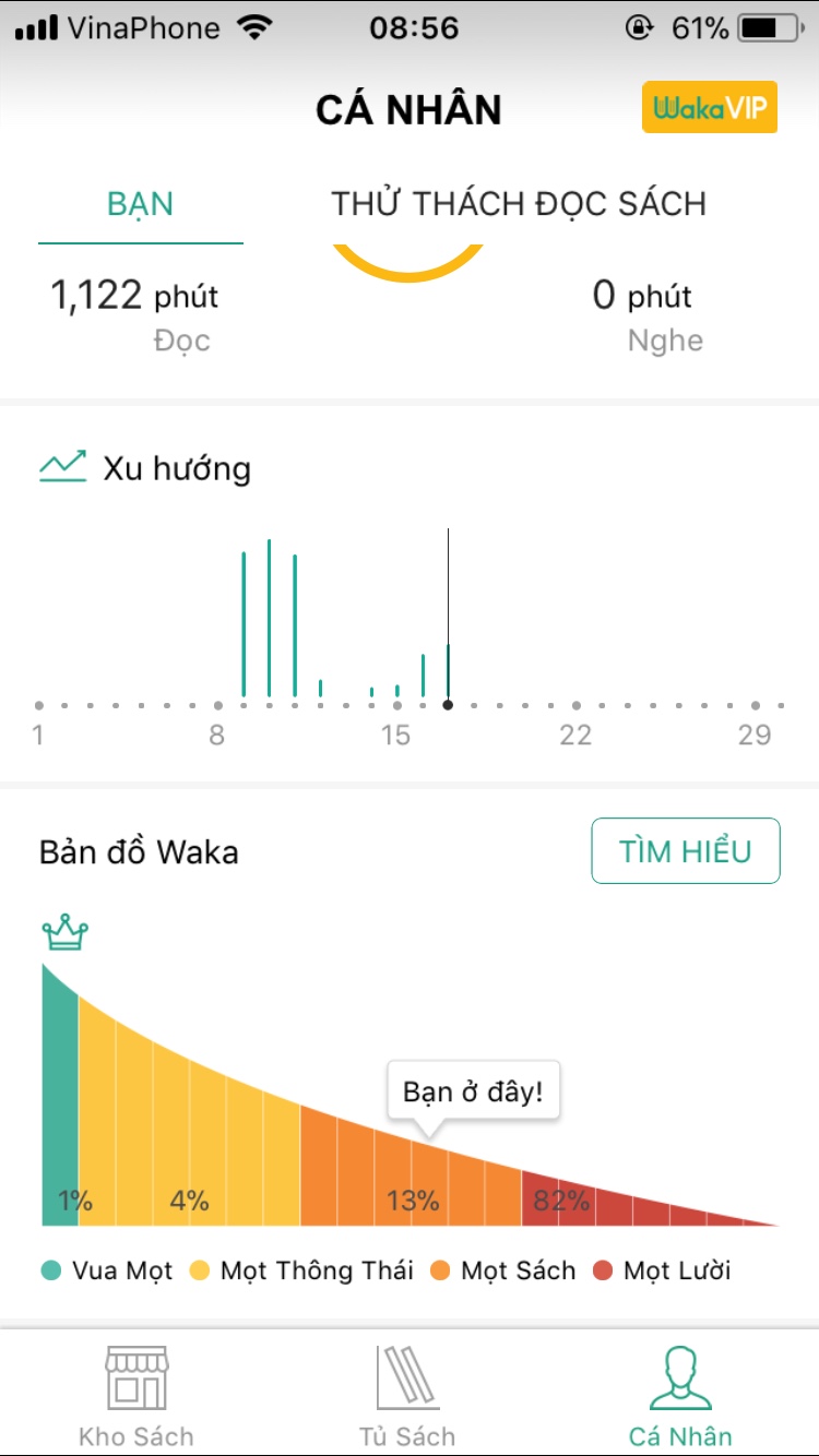 Mỗi khi các bạn đọc sách trên ứng dụng Waka, hệ thống sẽ đo lường thời gian đọc của bạn theo đơn vị tính phút và thể hiện ra trong phần thông tin cá nhân của bạn.
