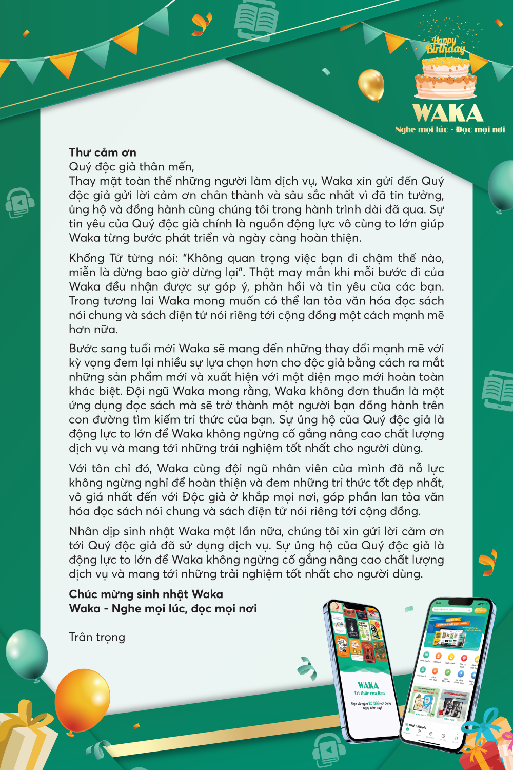 Nhân dịp sinh nhật Waka một lần nữa, chúng tôi xin gửi lời cảm ơn tới Quý độc giả đã sử dụng dịch vụ. Sự ủng hộ của Quý độc giả là động lực to lớn để Waka không ngừng cố gắng nâng cao chất lượng dịch vụ và mang tới những trải nghiệm tốt nhất cho người dùng.