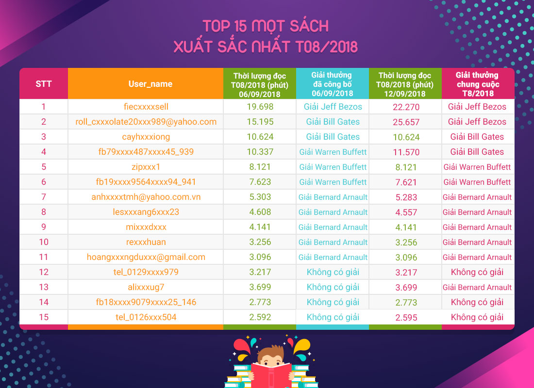 [Vinh danh] Đính chính bảng xếp hạng và trao giải "Thử thách đọc sách" tháng 8/2018
