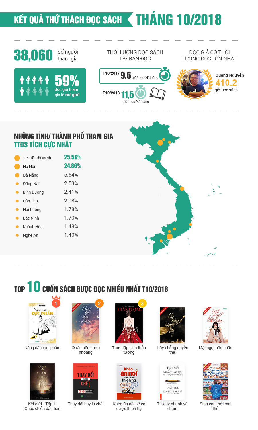 + TOP 5 tỉnh/ thành phố tích cực tham gia TTĐS nhất T10/2018 này bao gồm: Tp. Hồ Chí Minh, Hà Nội (hai thành phố lớn này chiếm tới ~50% tổng bạn đọc tham gia TTĐS), theo sau là Đà Nẵng, Đồng Nai, Bình Dương và rất nhiều địa phương khác.