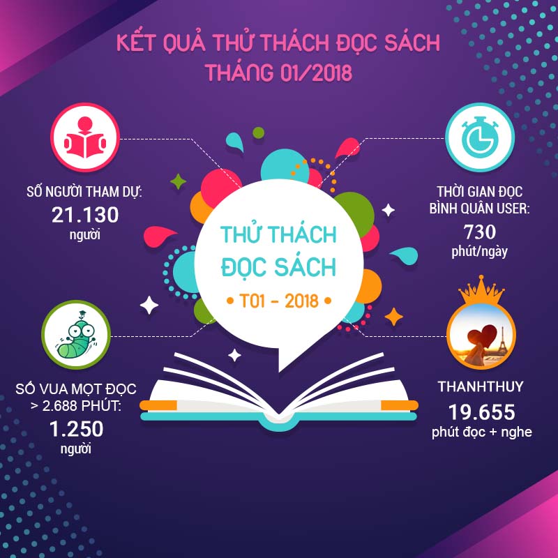 +  Số mọt tham gia TTĐS T1/2018: 21,130 mọt sách - Các mọt đã trở lại và lợi hại hơn xưa. Sang năm mới 2018 rồi, chúng ta cùng hãy cùng thử thách bản thân vượt qua những thành tích đã đạt được trong năm 2017 nhé!