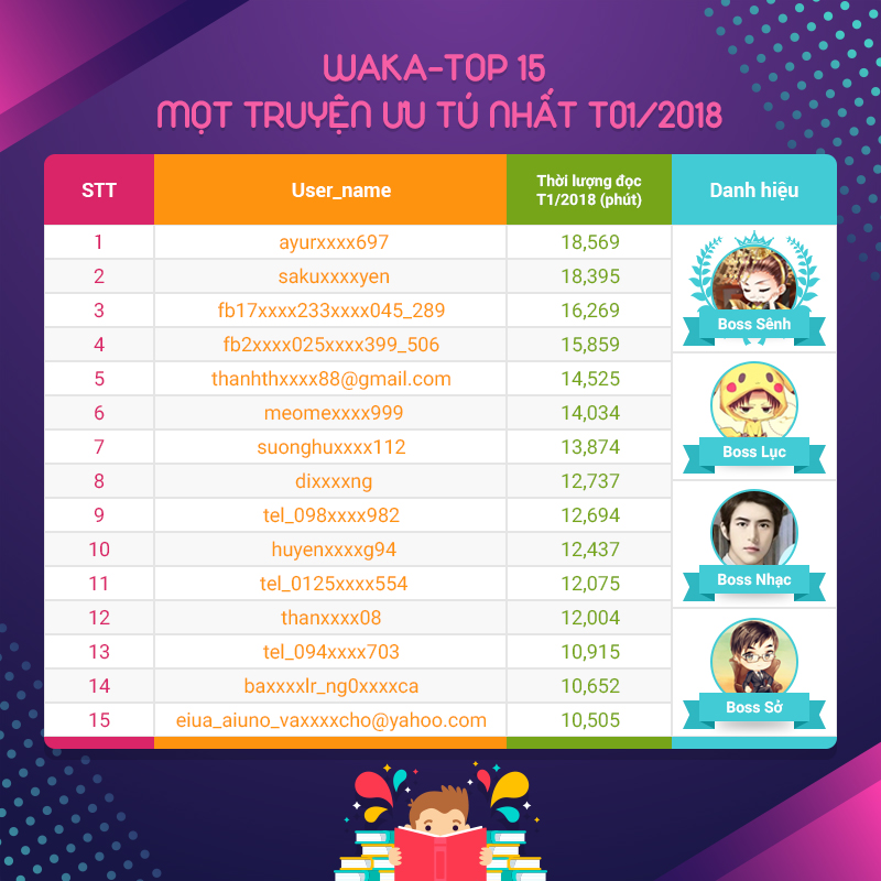 Tiếp theo, hãy cùng vinh danh TOP 15 Mọt Sách truyền cảm hứng nhất trên Waka và TOP 15 Mọt Truyện xuất sắc nhất trong tháng 01/2018 nhé các bạn! Trong tháng này, Waka đã phải huỷ kết quả của một bạn đứng TOP 10 bảng MỌT TRUYỆN vì lý do bạn ấy đã chia sẻ tài khoản cho nhiều người khác cùng tham gia đọc. Đọc sách là Thử thách bản thân mình cơ mà, hy vọng sang tháng 02/2018, Waka sẽ không phải huỷ kết quả của bạn đọc nào nữa!