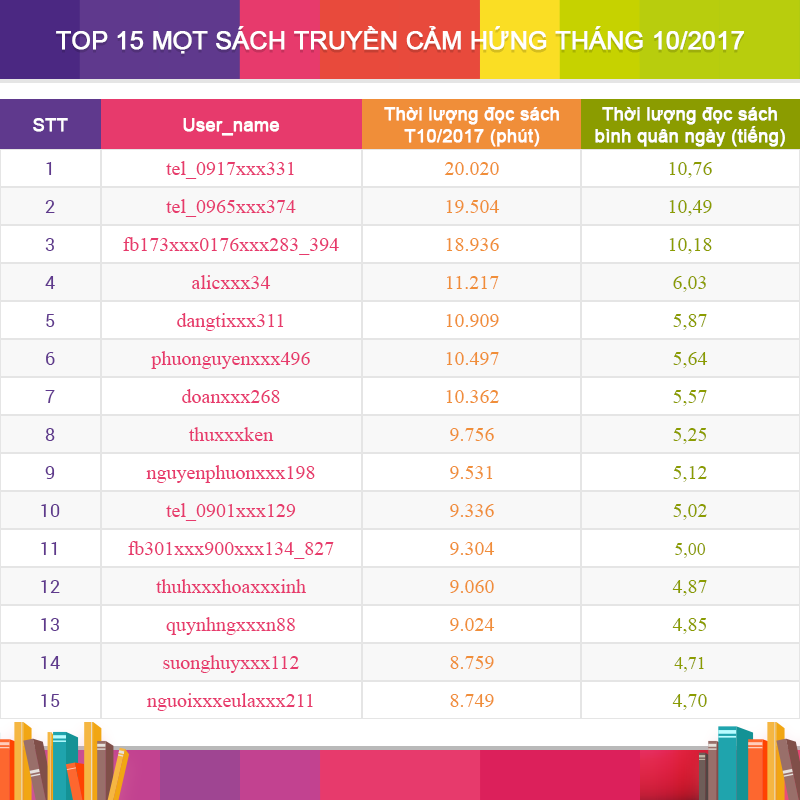 Hãy cùng vinh danh TOP 15 Mọt Sách truyền cảm hứng nhất trên Waka trong tháng 10/2017 nhé các bạn! Trong tháng này, Waka vẫn phải huỷ kết quả của 1 bạn có số phút đọc cao nhất do bạn này đã chia sẻ tài khoản để nhiều người cùng đọc, như vậy là không công bằng với các bạn đọc khác trên Waka nói chung và với chính bản thân các bạn nữa - đúng không nào? Hi vọng sang chương trình mới của tháng 11 Waka sẽ không còn phải hủy kết quả của bạn nào nữa.