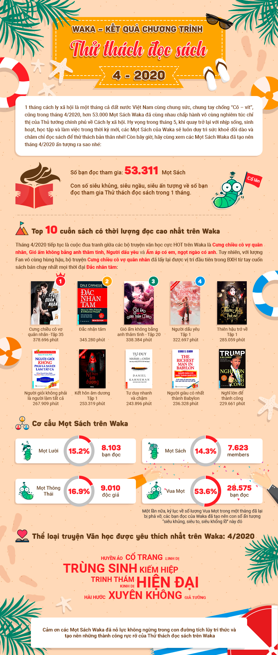 1 tháng cách ly xã hội là một tháng cả đất nước Việt Nam cùng chung sức, chung tay chống “Cô – vít”, cũng trong tháng 4/2020, hơn 53.000 Mọt Sách Waka đã cùng nhau chấp hành vô cùng nghiêm túc chỉ thị của Thủ tướng chính phủ về Cách ly xã hội. Hy vọng trong tháng 5, khi quay trở lại với nhịp sống, sinh hoạt, học tập và làm việc trong thời kỳ mới, các Mọt Sách của Waka sẽ luôn duy trì sức khoẻ dồi dào và chăm chỉ đọc sách để thử thách bản thân nhé! Còn bây giờ, hãy cùng xem các Mọt Sách Waka đã tạo nên tháng 4/2020 ấn tượng ra sao nhé: