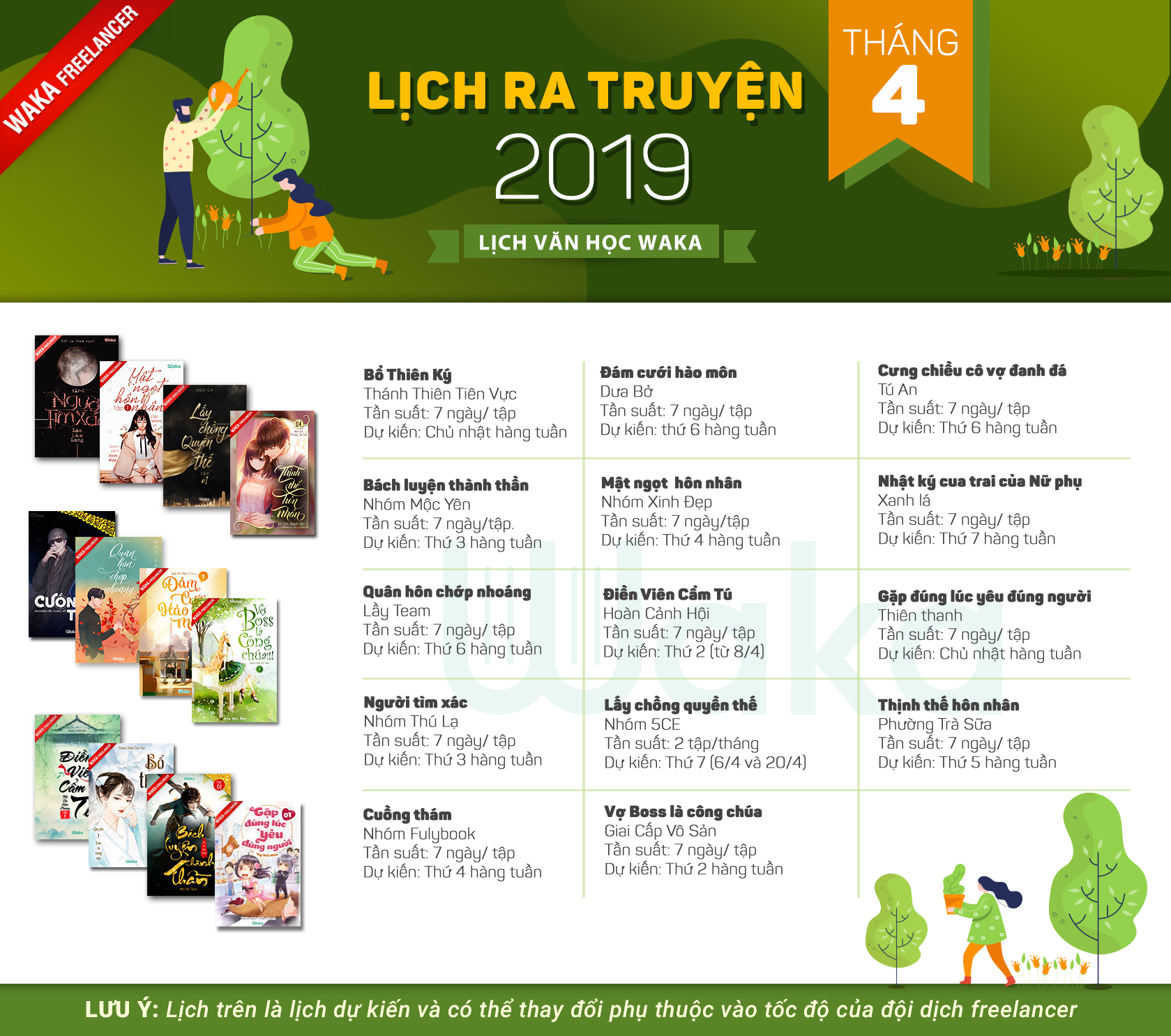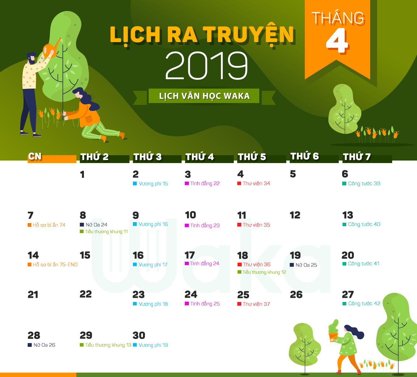 Đến hẹn lại lên, Waka xin thông báo đến các mem lịch văn học tháng 4 này, mem nhớ xem lịch để nắm được ngày lên truyện các bộ truyện mình yêu thích nhé!