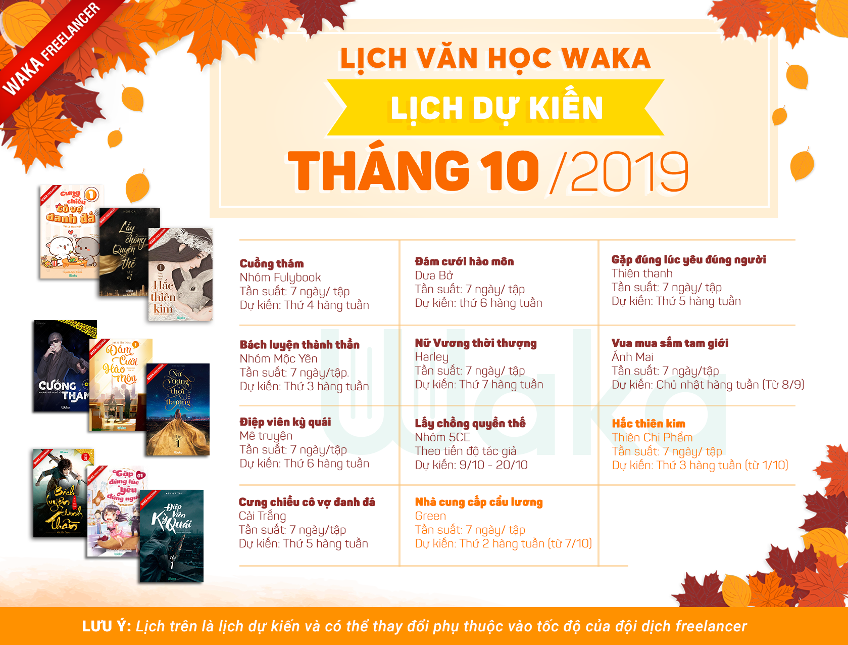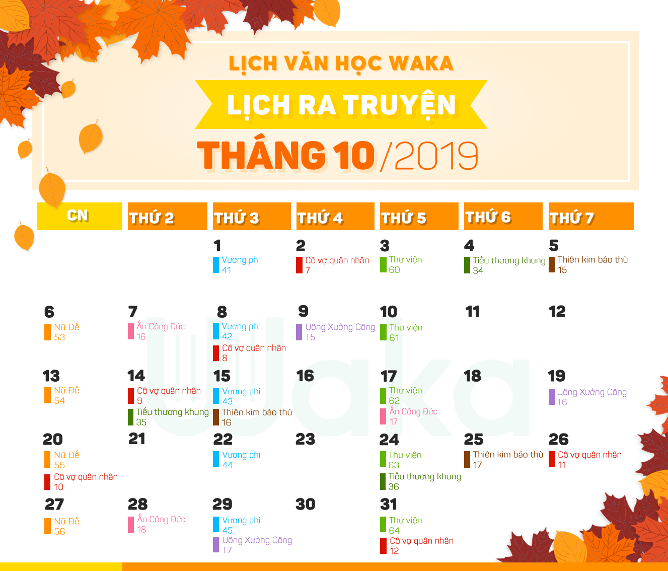 Mùa thu đã đến và độc giả chúng mình lại tha hồ lang thang trên các con phố ngắm cảnh lá rơi xào xạc dưới ánh nắng vàng rực rỡ thôi nhỉ? Đó là lí thuyết còn thực tế thì không khí hiện rất đang ô nhiễm nên Waka khuyên bạn nên ở trong nhà và đọc truyện để tránh ảnh hưởng tới sức khỏe. Vậy tháng này độc giả Waka chúng mình có những truyện mới nào lên và lịch các truyện cũ thế nào đây?