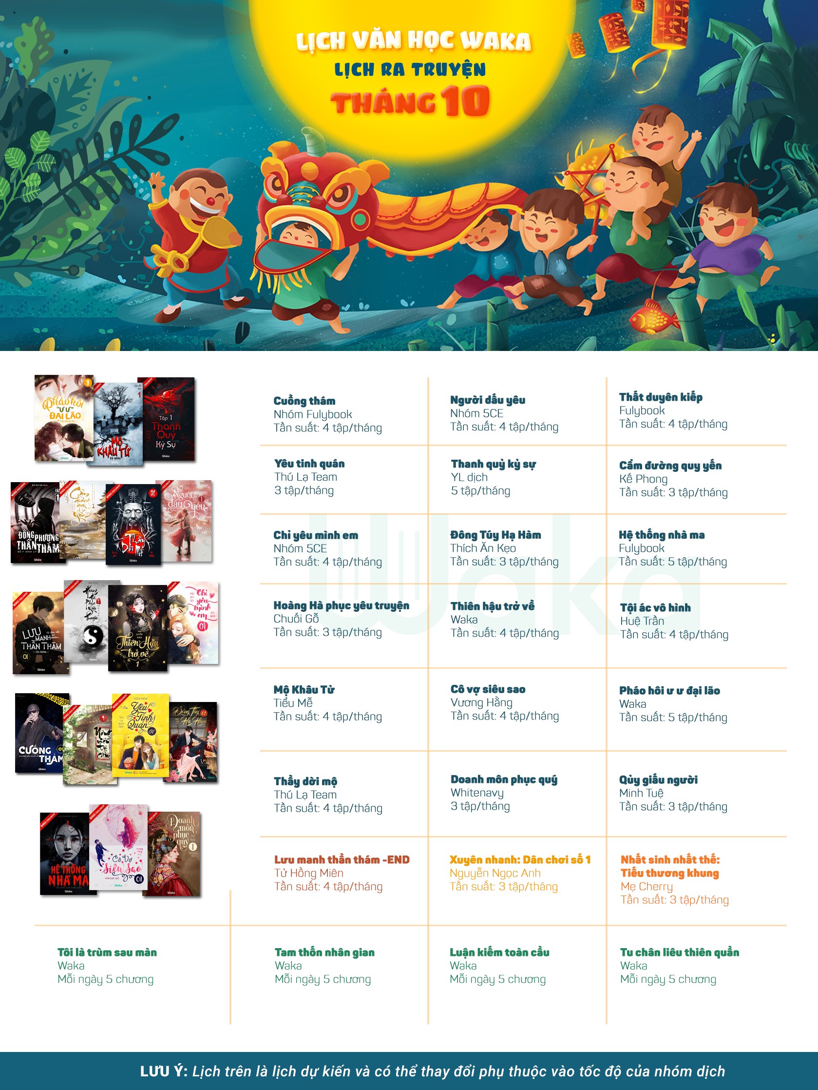 Các truyện với nhóm ngoài, Waka và các nhóm dịch sẽ luôn cố gắng duy trì tần suất đều đặn để các mem tiện lợi theo dõi lịch ra truyện và tháng 10 Waka vẫn sẽ chỉ công bố số tập dự kiến của các truyện thôi, các bạn độc giả của Waka nhớ đón đọc nha!