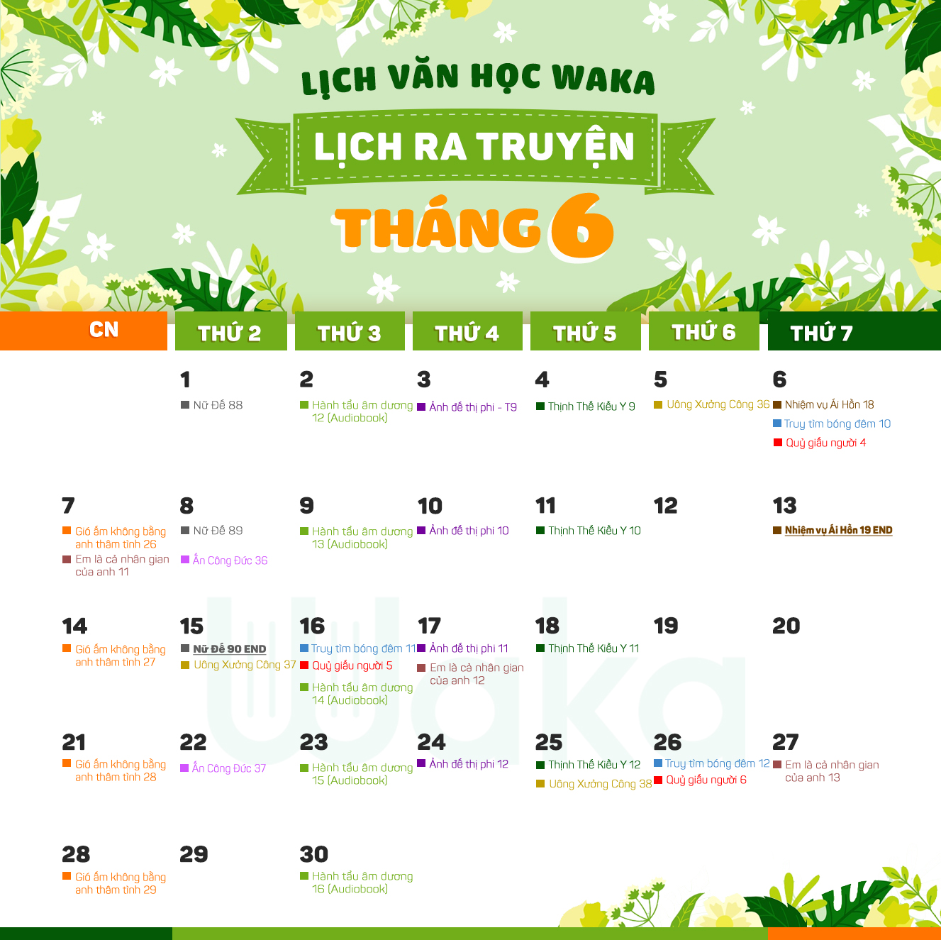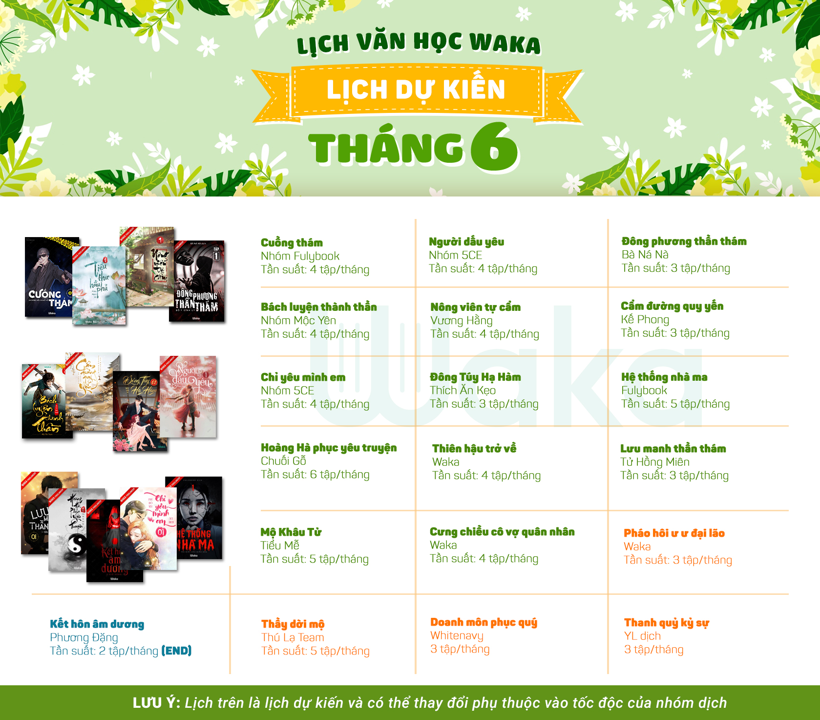 Các truyện với nhóm ngoài, Waka và các nhóm dịch sẽ luôn cố gắng duy trì tần suất đều đặn để các mem tiện lợi theo dõi lịch ra truyện và tháng 6 Waka cũng sẽ chỉ công bố số tập dự kiến của các truyện thôi, các bạn độc giả của Waka nhớ đón đọc nha!