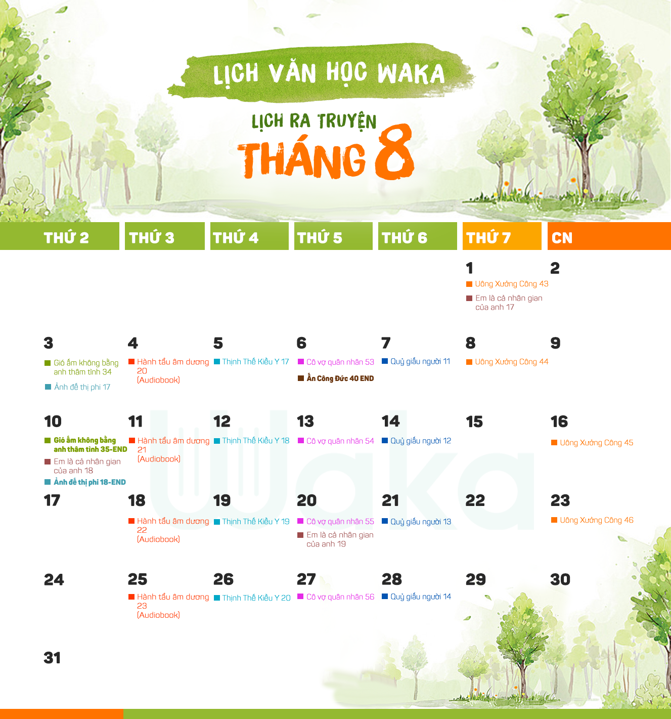 Các truyện với nhóm ngoài, Waka và các nhóm dịch sẽ luôn cố gắng duy trì tần suất đều đặn để các mem tiện lợi theo dõi lịch ra truyện và tháng 8 Waka vẫn sẽ chỉ công bố số tập dự kiến của các truyện thôi, các bạn độc giả của Waka nhớ đón đọc nha!