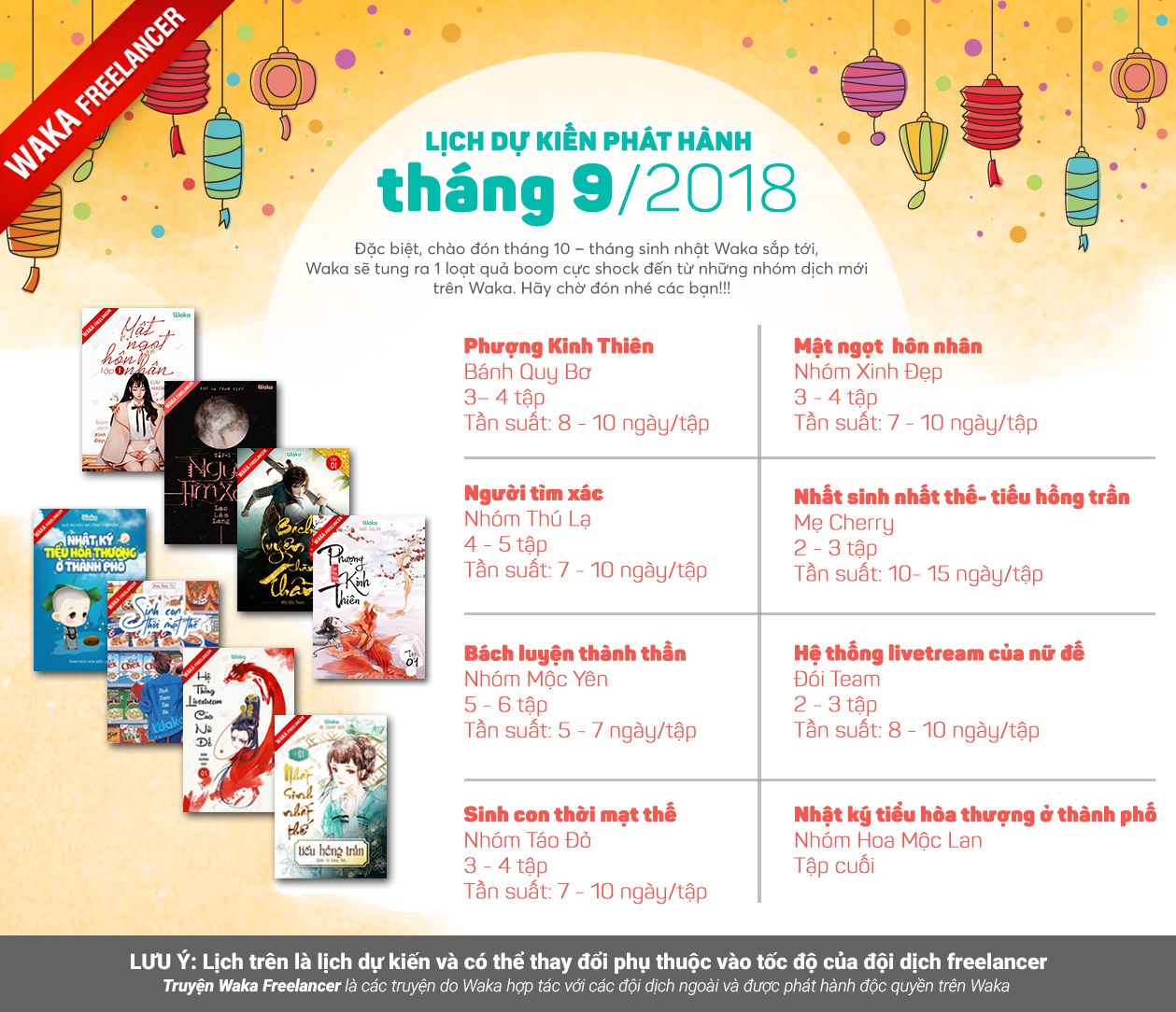 Ngoài ra các bộ truyện do Waka hợp tác với các team dịch ngoài (WAKA Freelancer) bao gồm: Hệ thống livestream của nữ đế, Nhật ký tiểu hòa thượng ở thành phố, Sinh con thời mạt thế, Nhất sinh nhất thế: Tiếu hồng trần, Người tìm xác, Mật ngọt hôn nhân, Bách luyện thành thần và Phượng Kinh Thiên sẽ được ra theo tốc độ dịch của các team nên lịch WAKA Freelancer dưới đây chỉ là lịch dự kiến thôi các bạn nhé! Nhưng đừng lo, các team dịch vẫn luôn nỗ lực hết mình để mang đến những tập truyện chất lượng và đúng hạn cho các fan văn học đó.