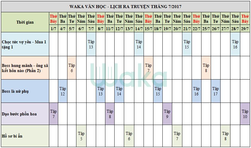 Lịch ra truyện hàng tuần trên Waka như sau:
